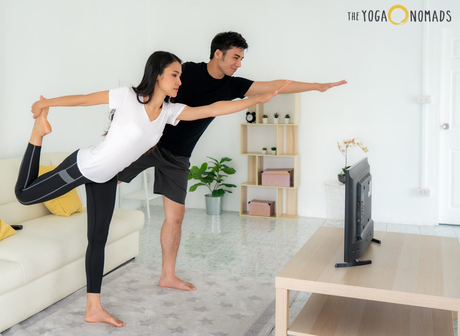 Young Asian couple doing yoga practice together and looking TV at home, man and woman working out together standing in living room, fit pair performing fitness exercise with partner.Conclusion