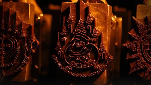 Readers may be familiar with popular sak-yant tattoos adorned on Hollywood celebrities like Angelina Jolie or British singer-songwriter Ed Sheeran. These tattoos are sacred because they consist of magical diagrams, or yant (the Thai pronunciation for the Sanskrit word, yantra). Hence, the tattoo form of yantra are sak-yant, since the traditional Thai method involves “tapping” (sak) the image onto the skin. However, the transition from marking human flesh to edible burger buns requires a different method for image transfer. Instead, for the burger bun, the yantra image is imprinted with a stamp. Baas commissioned a Buddhist monk to design and bless three unique yantra images for his custom-made culinary-grade stamps. The stamped buns quickly went viral, with foodies dubbing it “the world’s first sacred tattoo-burger.”