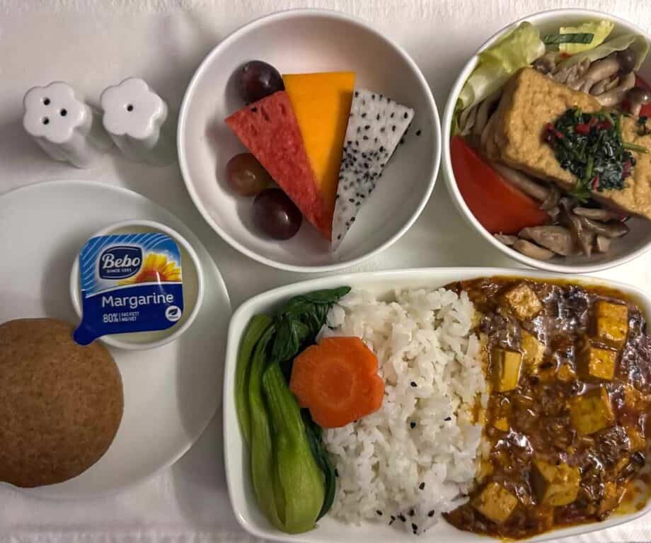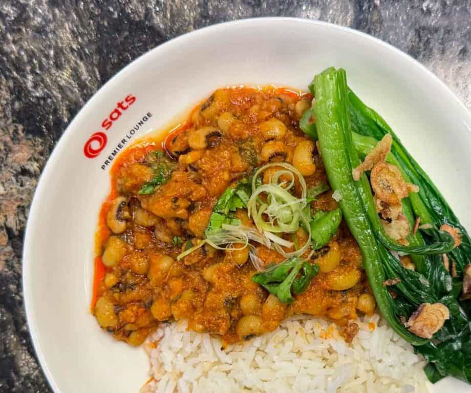 Everything was clearly labelled, which made it easy to realise there was very little for us to choose from. Salad, roast potatoes, cauliflower with black fungus and goji berries were the only items that we could have eaten with steamed white rice. There was delicious-looking marinated tofu but the sauce was not vegan, which was a classic case of ‘nearly, but not quite’. Our flight was delayed, which provided us with another option as new dishes were introduced to the buffet, including a black-eyed peas curry and kailan with fried garlic, which both paired perfectly with the aforementioned steamed white rice, making for a tasty and nutritious pre-flight bite whilst waiting for our delayed departure.