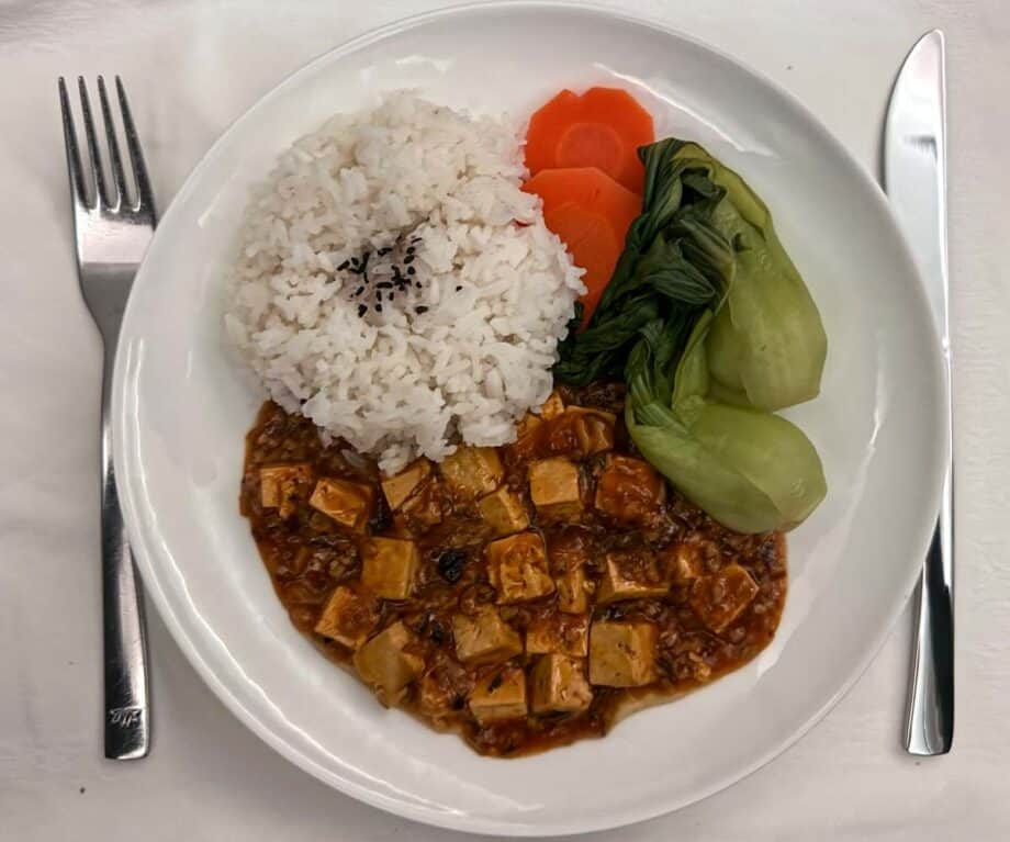 Next was an unappetising appetiser which we sent back. It comprised a stuffed pepper with beans and vegetables that were so cold they were almost frozen and were served with no sauce, which meant no flavour. Our main course was also sent back, a mixture of beans that were dry and flavourless with accompanying vegetables that were overcooked. This was possibly the worst vegan meal in business class that we have ever been served and was very disappointing indeed. The crew were very apologetic as they could see that everything we were served was uninspiring and not of a comparable standard to what other passengers were eating. They managed to find some instant noodles that were vegan and prepared these for us which were very tasty, but we didn’t book and pay for business class flights to eat instant noodles.
