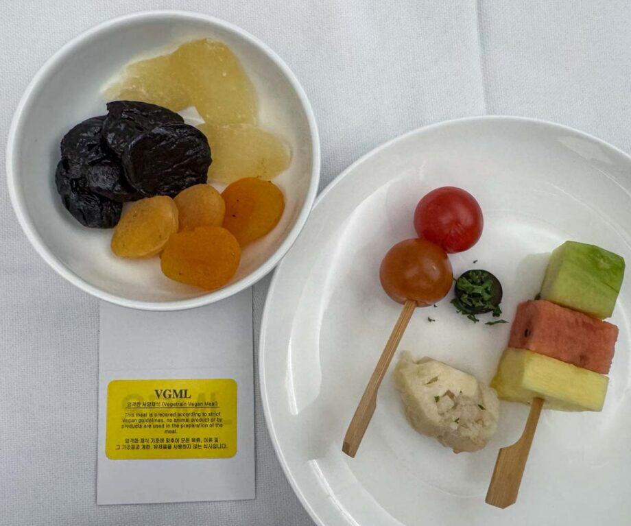 Our return flight was back on board the Dreamliner 787, so we knew what to expect in terms of layout and seat / flat bed. It was a daytime flight, so we didn’t plan to sleep but the fully reclining seat in business class certainly made our journey more comfortable. We were intrigued to find out if we would be served the same VGML meal again, or actually get to try something else from the kitchens that prepare meals for Vietnam Airlines. Well, it was different but sometimes you need to be careful what you wish for as our previous repeat tofu dish was far superior. First were ‘canapés’ that consisted of a single fruit skewer, two cherry tomatoes, half an olive and some dried fruit which were all of course edible, but hardly creative or exciting.