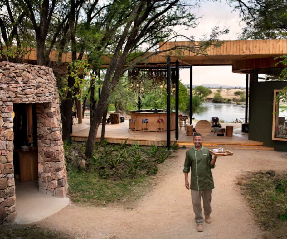 The welcome starts even before you make eye contact, as you’ll hear the staff sing when you’re still driving towards the entrance. Once you step out of the vehicle, warm smiles, cold towels and a welcome drink all await. Swiftly you are led to the main area which entails the restaurant, bar, terrace, lounge and tucked away in the corner also a little shop. It’s all very seamless and once you sit down you’ll instantly notice the hippos which are almost motionlessly looking at you from the river.