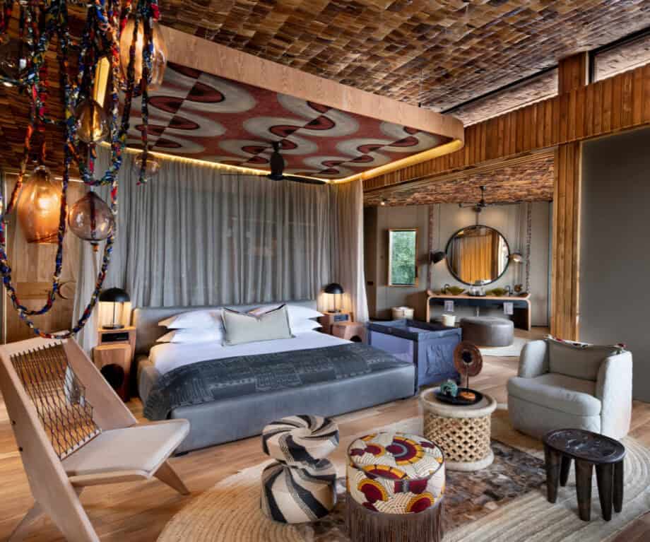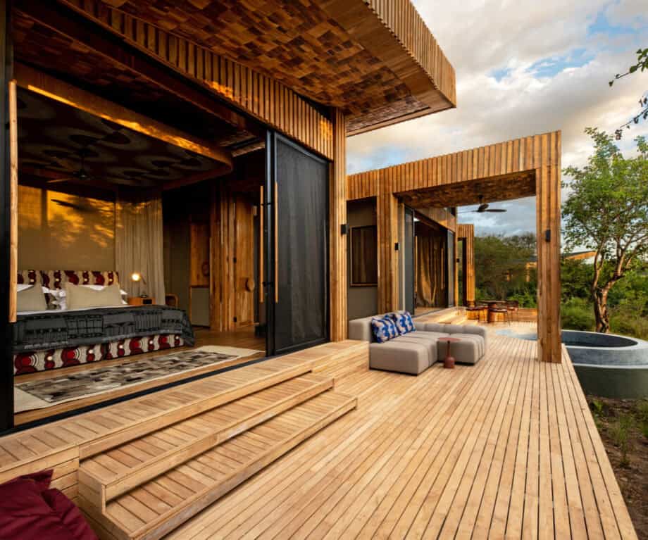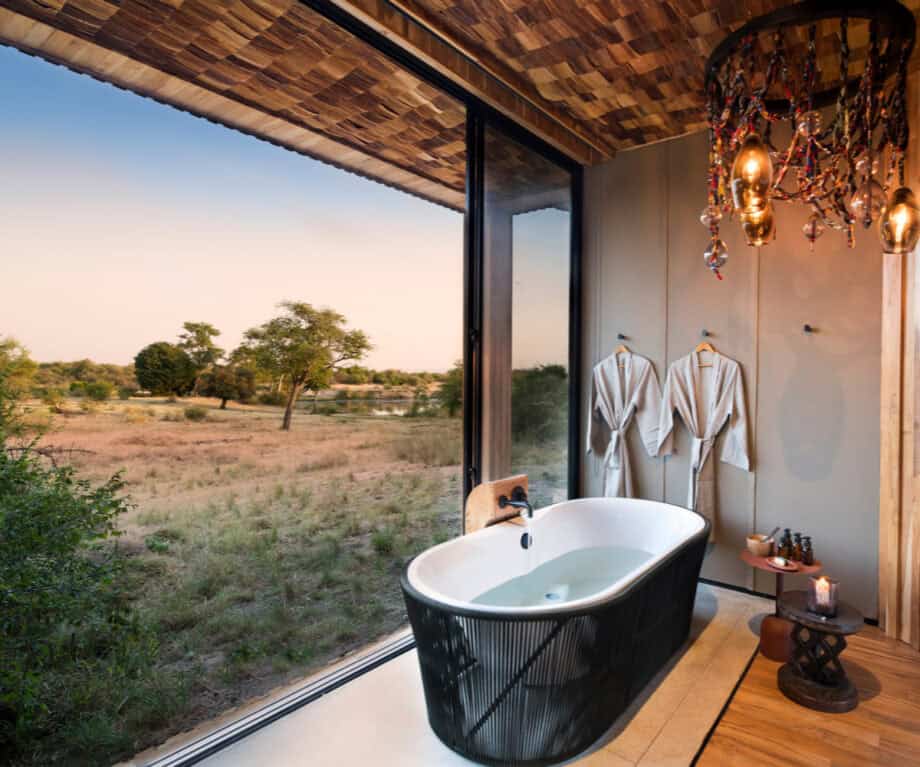 While the design is very open plan, and thus the bedroom and bathroom flow into each other, it can be closed off by a massive curtain that runs the length of the suite. There’s a double sink and a massive mirror against the wall while on the side you’ll find the freestanding bath tub overlooking the bush outside. There’s of course also a massive shower and conveniently placed in the middle of the bathroom area you’ll find this massive pouf which surely comes in handy in the morning when you stumble out of bed and try to find your bearings.